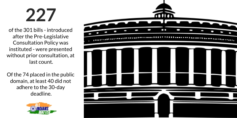 The Pre-Legislative Consultation Policy says the government should place a draft version of any law it makes before the people for their inputs. This is important for a truly participative democracy. However, at last count, 227 of the 301 bills placed in Parliament after the policy was introduced were presented without prior consultation. The attempt to become not just a representative but a deliberative democracy has failed to take off. Public policy expert Arun PS, who has a special interest in the Pre-Legislative Consultation Policy, speaks to All Indians Matter.