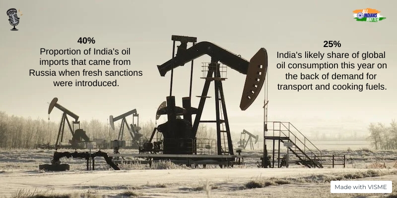 Did you know that India’s daily oil consumption is roughly 5.5 million barrels a day, which accounts for 5% of the world’s total crude consumption and puts it among the top oil consumers in the world? India’s greatest source of crude is Russia, which makes for a remarkable 40% of its total oil purchases. This is up four-fold from 2021, a year before Russia invaded Ukraine. In fact, it was after the invasion that India became a major buyer of Russian oil, when the US enforced a price cap of around $60 per barrel on Russian crude. The objective was to limit Russian earnings from crude exports but India seized the opportunity to buy cheaper oil.